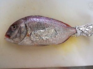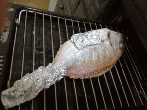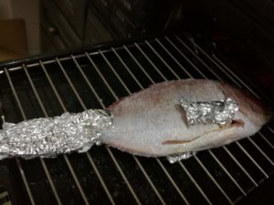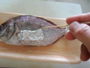 - 背ビレ、胸ヒレ、尾ヒレは焦げないように、アルミホイルを巻いて保護します。