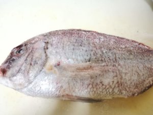 - 鯛からでた水分をキッチンペーパーできれいにふき取ります。