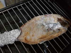 アルミホイルを外すときに、胸ひれが折れてしまいました…。