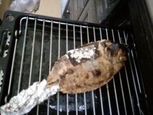 仕方がないので、右向きで置くことに(;^ω^)エラ部分も焦げやすいみたいです。自宅で調理は難しい…です。